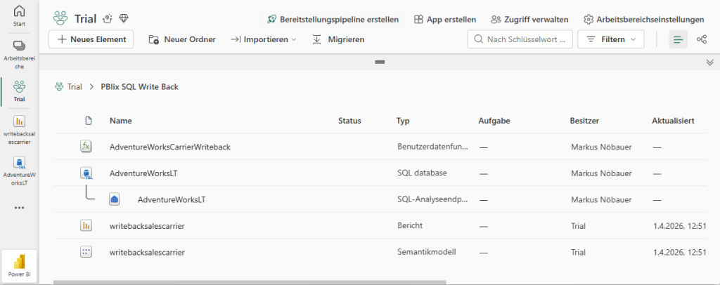 I’ve implemented a small demo application in Fabric. The workspace contains a SQL database, a User Data Function and a PowerBI report.