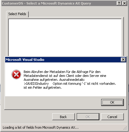 A colleague started to develop a report in Visual Studio and experienced a strange exception when selecting a query as dataset. It said that an exception occurred in the metadata service >SOMEFIELD option with ID -1 was not recognized