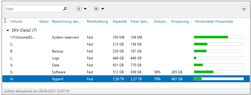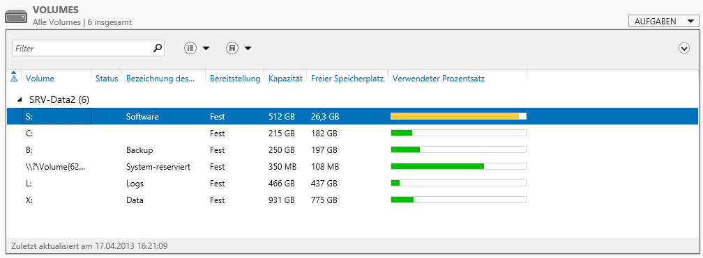 Here is an example for an iSCSI connected LUN. Drive S: is our Software Archive with installation files, MSDN Downloads, Trial Versions, etc. All these files require about 480 GB storage.