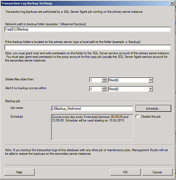 The backup at the primary server SQL1 was scheduled to run every 5 minutes. Files older than 1 hour in the LSBackup folder will be deleted.