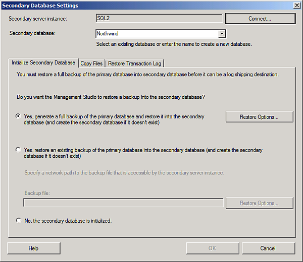 Next the transaction log shipping configuration was redone, as described above. Again the target database at SQL2 was initialized by a full backup of the Northwind DB from SQL1. Finally the secondary server SQL2 was able to restore the .trn files.
