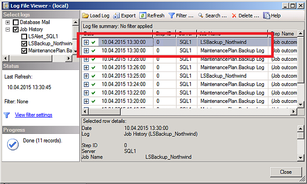 The copy job at the secondary server SQL2 was scheduled to run every 5 minutes. This job copies .trn files from the LSBackup folder into the LSCopy folder. Files older than 1 hour in the LSCopy folder will be deleted.