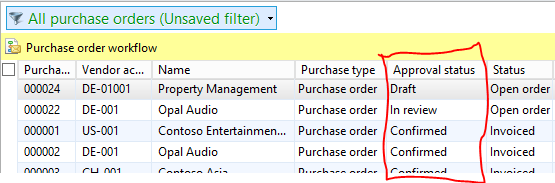 Create a new purchase order. The purchase order starts in the approval state Draft. Submit it to the workflow for approval. This will change the state to “In Review”. Go back to the Purchase Order List Page and refresh the data. It may take a few minutes, depending on your workflow batch jobs configuration, until the purchase order is assigned to you for approval. When the purchase order is assigned for approval, approve the purchase and wait a few minutes until the purchase order has reached the state approved.