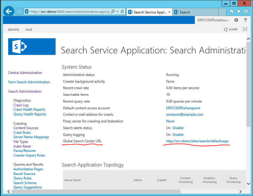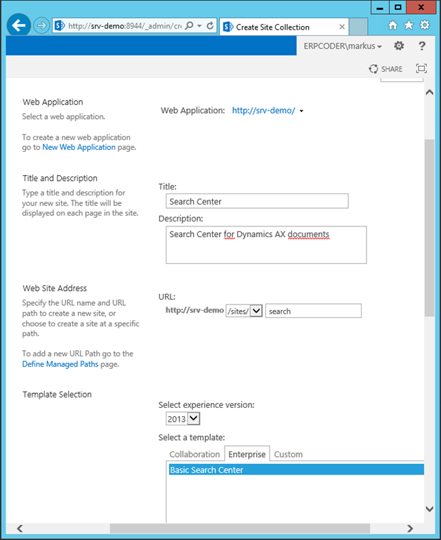 Open SharePoint Central Administration and click the group Application Management. Go to “Create Site Collection” . Make sure your are using the same Web Application as the Team Website. Call the new site collection “Search” and provide an URL including like http://YOUR_SERVER/site/search. Make sure to select the “Basic Search Center” template from the Enterprise template group. Click OK, this will create a new basic search center.