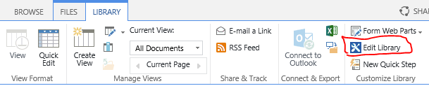 Go to the newly created document library. Open the Library ribbon, and edit library with SharePoint Designer. SharePoint Designer is not installed by default, and you may have to download and install it first.