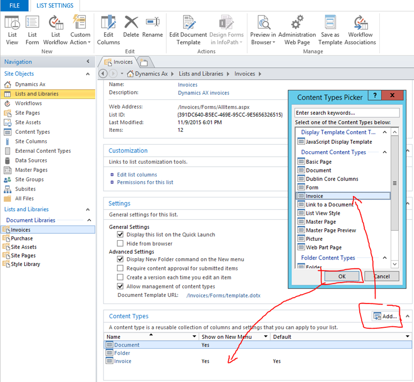 In the navigation, select Lists and Libraries and open the Invoices library. Make sure the option “Allow management of content types” is enabled. At the “Content Types” group at the bottom, open “Add” and select your newly created Invoice content type. This will add the content type to the document library.