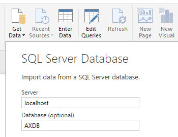 Start Power BI for Desktop and start with an empty report. From the ribbon on top click “Get Data”, choose SQ Server and provide your server and database. In this example I’m using a single server installation. However, in a production environment you might need to provide <SERVERNAME> \ <INSTANCENAME> , <PORT> e.g. SRVSQL\PROD,2303.