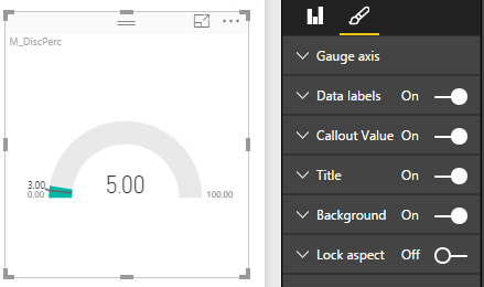 Add a new Gauge to the report and use the Measure M_DiscPerc as value. You cannot set a hardcoded Min. and Max. value in the data properties. Switch to the Format view using the pencil icon.  In the group Gauge Axis, set the Min. Value 0, the target value to 3 and Max. Value 100. Depending on your data, the gauge may look like this: