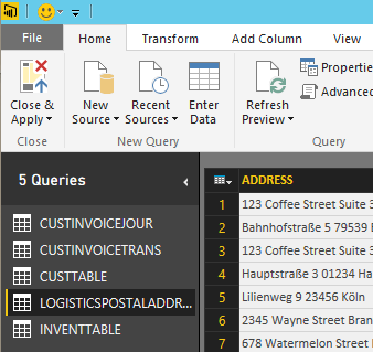 In Power BI for Desktop, at the Ribbon click “Edit Queries”. This will open the query editor. We don’t need all columns for this Demo. For each table click the “Choose Columns” button and the select only the following columns: