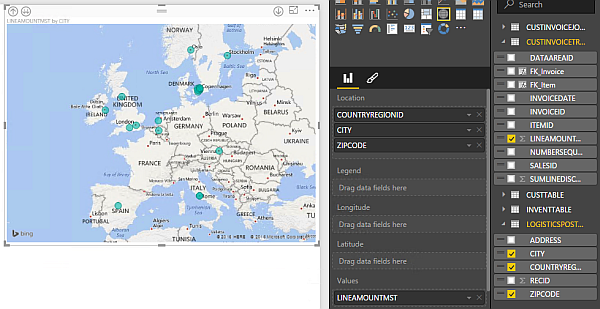 Next, place a map from the toolbox on the report. Drag&Drop the fields CountryRegionId, City and ZipCode from the LogisticsPostalAddress table on the Location. Drag&Drop the LineAmountMST from the CustInvoiceTrans on the Values Field. The map should look like this: