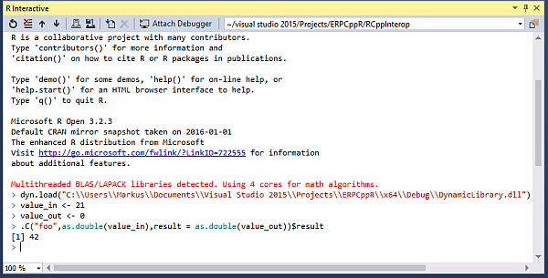 The programming language R is great for statistics and analysis. R is becoming more and more relevant for business analysis. Microsoft has already integrated R in SQL Server 2016, Power BI and offers an open source R Implementation and Visual Studio integration. There are many tutorials for C interop with R but most of them use Linux tools and not Visual C++. This is a walkthrough how to build a C++ DLL and use it in R all in Visual Studio.