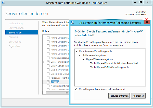 Next uninstall the HyperV role using the Server Manager. Simply select remove roles and features and select the HyperV role. This step requires a reboot and your server will come up a simple plain windows 2012 server.