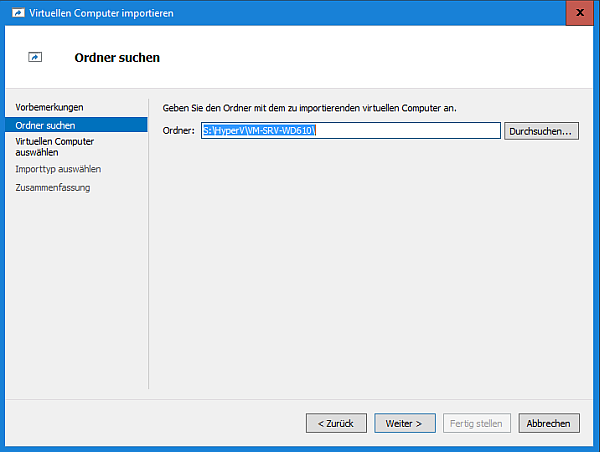 Next provide the folder where the virtual hard disk files are placed. Don’t get confused because you don’t see the actual VHDX files in the selection dialog. The import wizard will check if the virtual hard disk named in the configuration file can be found in this folder. If the wizard can’t find the virtual hard disk file, take a look a the list of vhdx file paths generated by the PowerShell script.