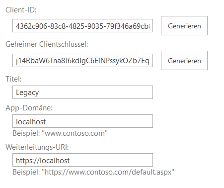 The first thing you need to do is register an App in SharePoint Online. Open the registration site in a browser: https://YOUR_SITE.sharePoint.com/_layouts/15/appregnew.aspx . In my case I’m using a sub site, therefore my URL would look like this: https://YOUR_SITE.sharepoint.com/sites/development/_layouts/15/appregnew.aspx .Use the form to generate a client ID and a secret code. Provide any title you like. Set the domain to localhost and redirection URL to https://localhost