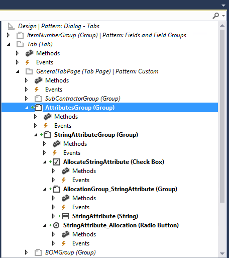 You need to create a group, hat contains another group, with a checkbox and group with a string edit field and a radio button. Make sure to name the elements like shown in the screenshot. If you are not sure, compare it with the other existing groups e.g. the SubContractor. You will need to compare the properties of each element with the corresponding properties of an existing element to make it look similar.