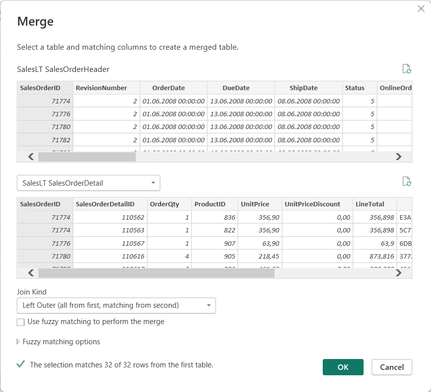 Load both tables using PowerQuery. Select the SalesOrderHeader table. From Home tab, select Merge Queries. Join both tables via SalesOrderID and select LEFT OUTER JOIN as join type.