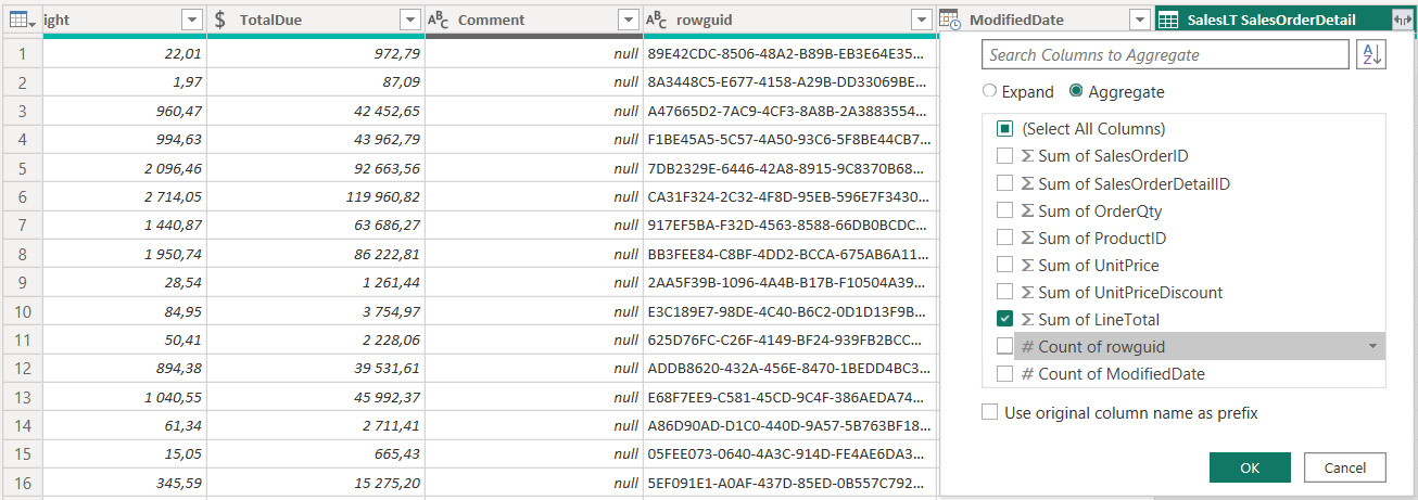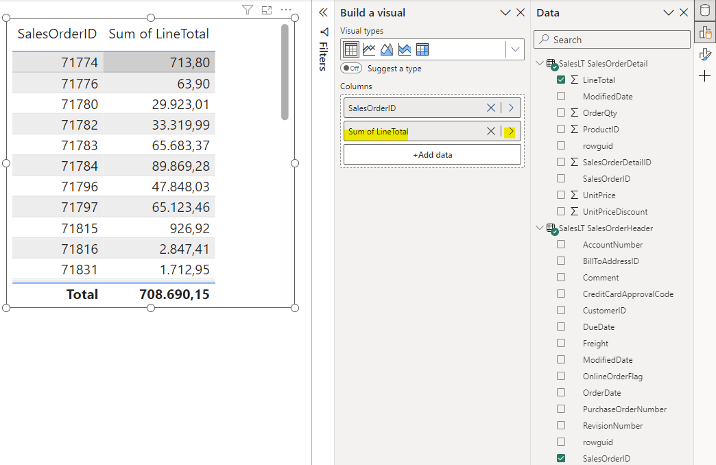 Make sure you have an active 1:n relation from SalesOrderHeader to SalesOrderDetails via SalesOrderID. Add a table visual and place the SalesOrderID from the SalesOrderHeader table. Add the LineAmount from the SalesOrderLines and choose to aggregate as Sum.