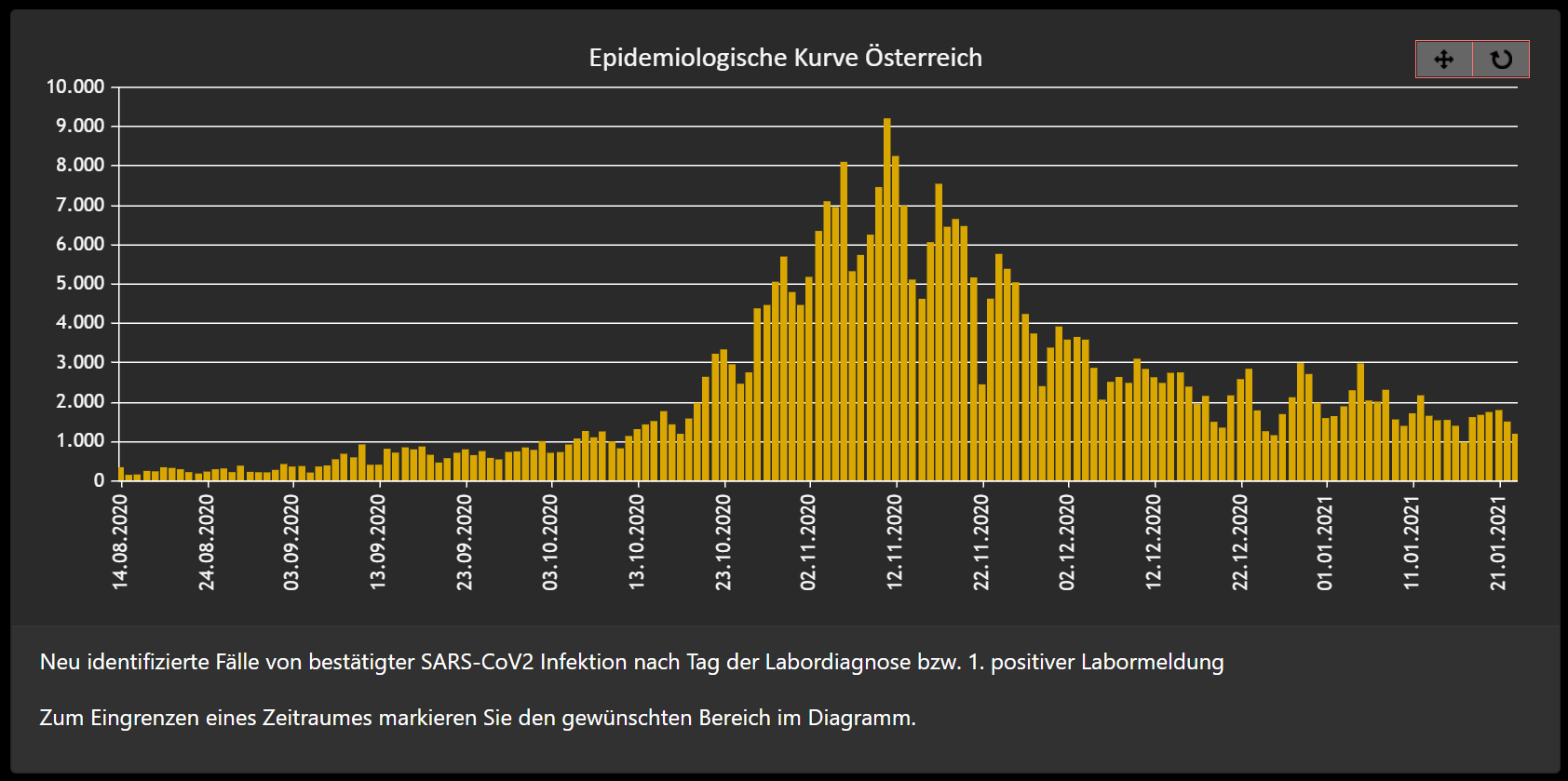Since Summer 2020 the Austrian government is maintaining a traffic-light color encoded map to visualize the Covid-19 situations in parts auf Austria. Green stands for low risk, yellow medium risk and red high risk. A committee is evaluating the situation every Thursday and presents the new map in Friday. However, since the beginning of the second wave in later autumn 2020 the map is deep red for all parts of Austria. Because the number of infections per day remains at a very high level for weeks, it was decided to pause the map.