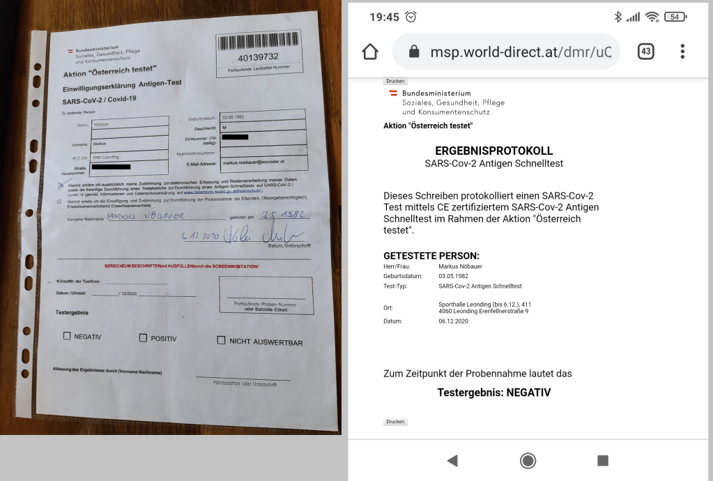 Austria is staring voluntary free mass-testing. The army is organizing hundreds of testing sites all over the country. Anti-Gen quick tests are used to identify infectious people. These test have a very low false-negative rate. In case someone is identified as positive, a PCR test is done. Hopefully many non-symptomatic infections people can be found and isolated before Christmas to avoid a third wave and a third lock-down in January. While the registration was a digital disaster the testing itself was easy. Make an appointment and fill out a form. Bring the form and an ID card to the test site. If you have no printer at home it will be printed for you. Get tested and leave the test site. The result is sent to your mobile phone after aprox. 15 minutes.