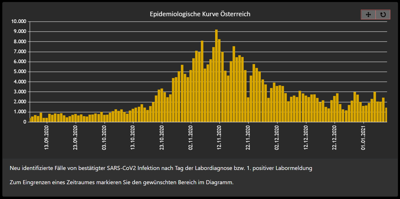 Since 26.12 we are still under lock-down. It looks like Christmas didn’t cause a rapid spike of infections. However, the goal from the second lock-down to reduce the second wave under 1000 infections per day is still not reached. The actual situation, restaurants and retail closed but offices allowed keeps the curve constant at ~ 2000 infections a day. After the holidays, today is the first “real” working day.