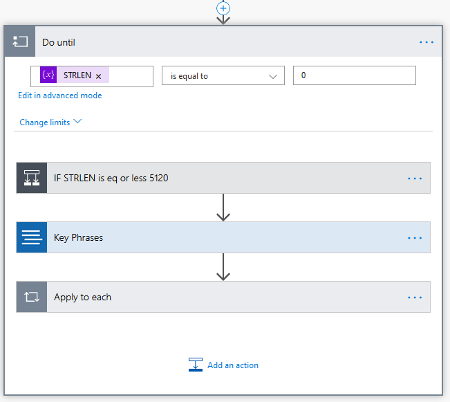 Unfortunatelly, the text processing in Cognitive Services is limited to 5120 characters. In many cases, Emails contain more characters than this and the flow will fail with an error from the Cognitive Services. One way to address this issue, is to implement a loop that cuts the Email body into pieces of 5120 characters or less before feeding it to Cognitive Services. However, Flow is not very developer focused and requires some workarounds for simple tasks like assigning function calls with a variable to itself e.g substring()