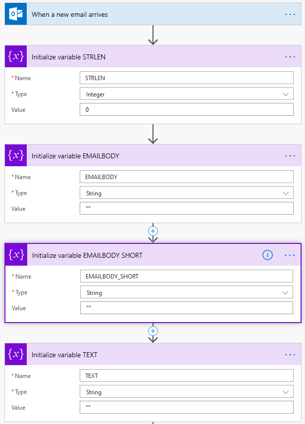 In the third step, the variable EMAILBODY_SHORT is set to the substring starting at 5121 till the end of the original EMAILBODY. Is is done, because Flow does not support variable asignment by a function that contains the variable itself: substring(variables(‘EMAILBODY’),5121,sub(variables(‘STRLEN’),1))