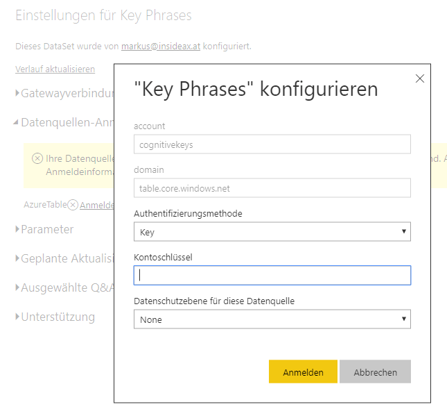 Publish the PowerBI report to your workspace. Within PowerBI Online, go to your workspace and navigate to the dataset. From the Elipsis (…) open the settings page. Provide the Key for Azure Table storage.