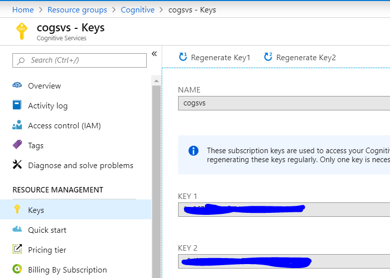 At the Cognitive Services Overview tab, copy the Endpoint URL. From the Cognitive Services > Key tab also copy the Key1. You need both to connecto to the cognitive services.