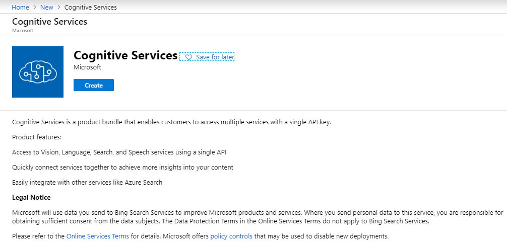 First, go to your Azure portal and create a new Cognitive Services Resource. In the creation wizard place the cognitive services to a data center near your Office subscription. I’d also recomend to creata a seperate resource group where you place all the services.