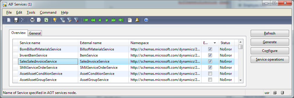 7. Go to Basic > Inquiries > Batch jobs. Make sure to run a batch job that processes the AIF message send and receive tasks: AIFInboundProcessingService, AIFOutboundProcessingService, AIFGatewaySendService and AIFGatewayReceiveService.