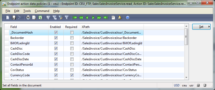 AIF is great for application integration and providing external applications required data. Document exports can be generated very easily by providing a query to the AIF document wizard. However, if you want to provide not only table fields but calculated values (e.g. display methods) in an AIF document some work is required. This is an example how to add the CustInvoiceJour.contributionMargin() method to the SalesSalesInvoiceService.