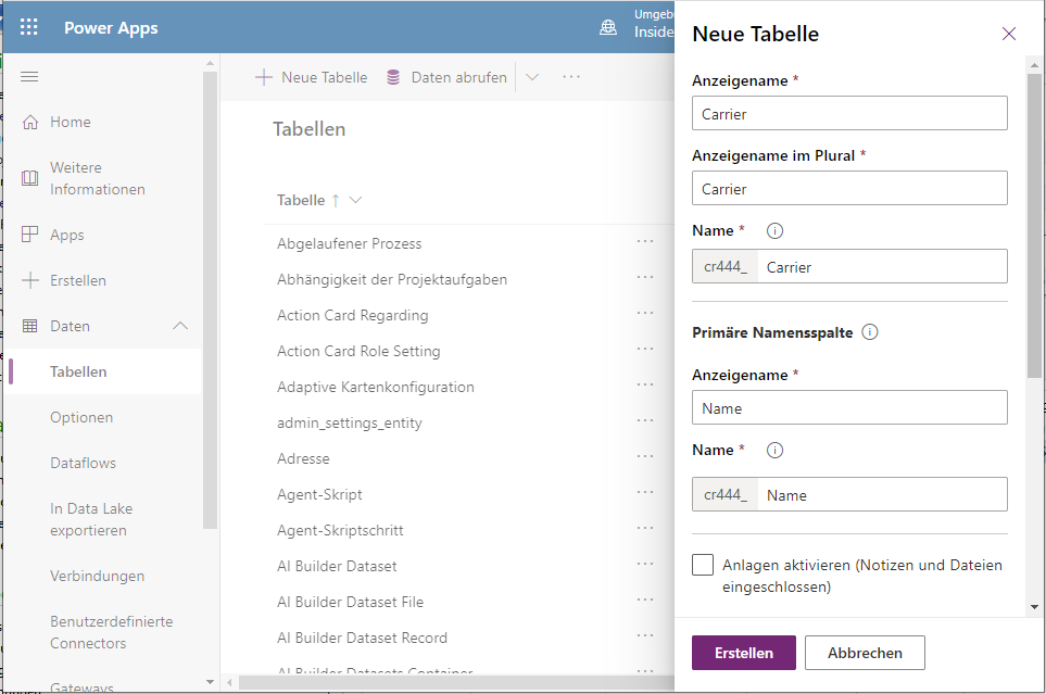 Navigate to https://make.powerapps.com and switch to your target environment. Go to Data > Tables and create a new table for the carrier. The table shall match the carrier table in Dynamics 365 FO. Make the Name field as mandatory primary field and add a second optional text field for the Description. Add a lookup field to the existing company table to match the DataAreaId that will come from Dynamics 365 Finance. Note that PowerApps will add a lot of other fields like owner, created, etc. as well.