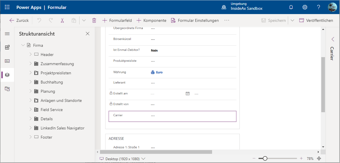 In the PowerApps designer add the Carrier field to the form. Save the change and publish the customized form.