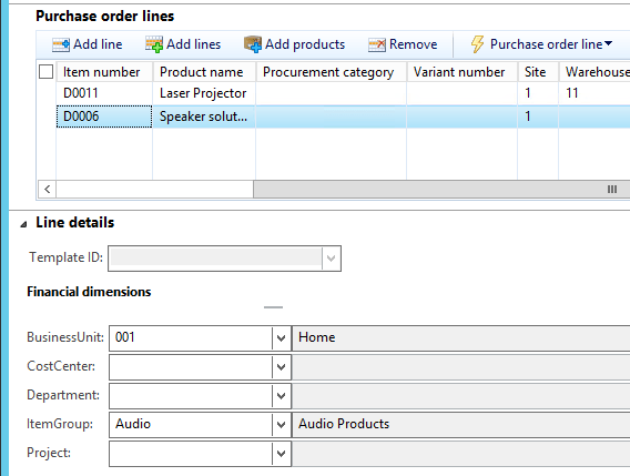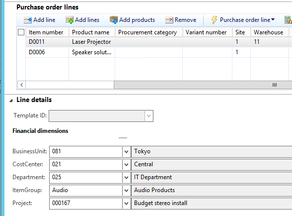 FinDim.Department, FinDim.ItemGroup, FinDim.CostCenter, FinDim.BusinessUnit, FinDim.Project