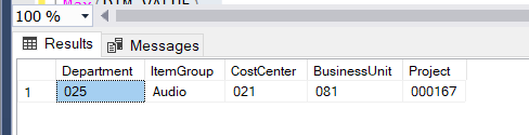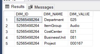 SELECT * FROM ( select DIMENSIONATTRIBUTE.NAME as DIM_NAME, DIMENSIONATTRIBUTEVALUESETITEM.DISPLAYVALUE as DIM_VALUE from DIMENSIONATTRIBUTEVALUESET join DIMENSIONATTRIBUTEVALUESETITEM on DIMENSIONATTRIBUTEVALUESET.RecId = DIMENSIONATTRIBUTEVALUESETITEM.DIMENSIONATTRIBUTEVALUESET join DIMENSIONATTRIBUTEVALUE on DIMENSIONATTRIBUTEVALUESETITEM.DIMENSIONATTRIBUTEVALUE = DIMENSIONATTRIBUTEVALUE.RECID join DIMENSIONATTRIBUTE on DIMENSIONATTRIBUTEVALUE.DIMENSIONATTRIBUTE = DIMENSIONATTRIBUTE.RECID where DIMENSIONATTRIBUTEVALUESET.RECID = 52565498264 ) AS SourceTable PIVOT ( Max(DIM_VALUE) FOR DIM_NAME IN ([Department], [ItemGroup], [CostCenter], [BusinessUnit], [Project]) ) AS PivotTable