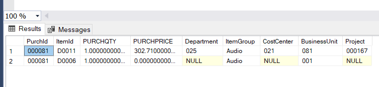 The result set are two records, one for each PurchLine, and the corresponding financial dimension values: