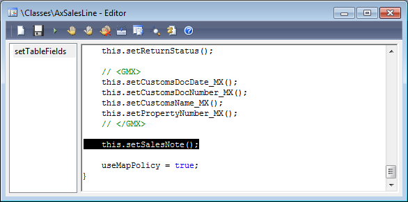 7. Add a parameter method for the salesNote field to the AxSalesLine class