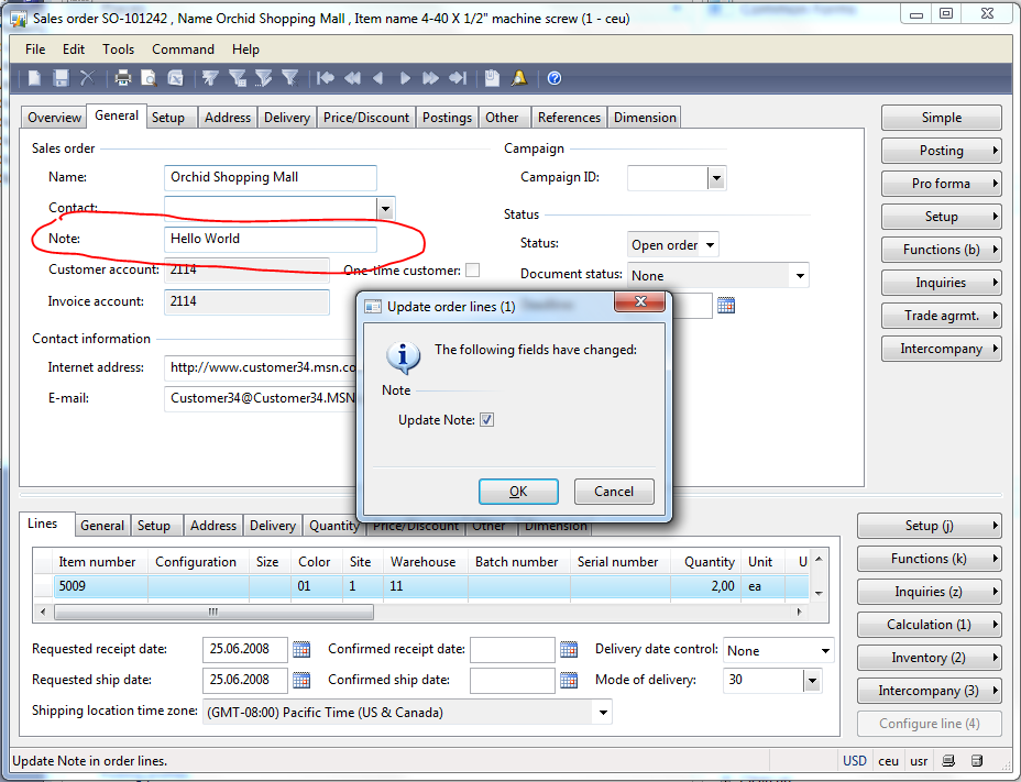 Test your modification. Open the “Update order line” form and set the update method for Sales Notes to “Prompt”. Open the sales order details form, go to your new field, modify the text and save. A dialog will appear and ask your to update the Note fields. Click OK, and review the Sales Notes in the SalesLines.