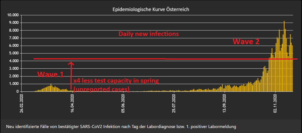 The second Corona wave hit us hard in Austria. After a very chilly summer, Corona strikes back. Compared to the first wave, testing capacities have rising up to 4x times. But even when considering a high number of unidentified cases in spring, the number of infections is much higher now and hospitals are now reaching their capacity limit.