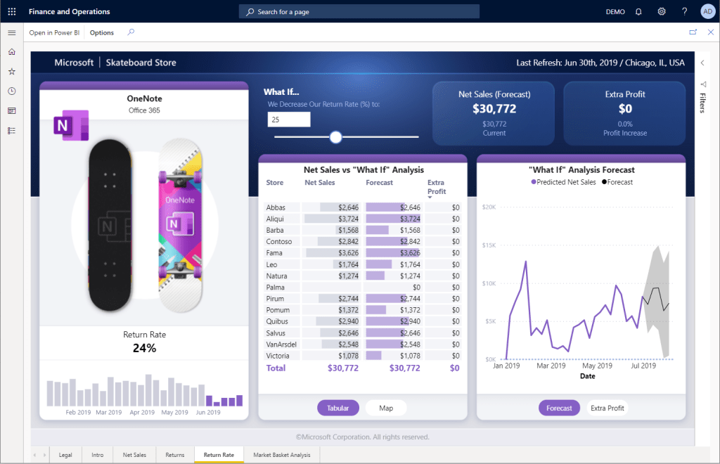 An interactive custom Power BI Report viewed in Dynamics 365 Finance via the users Report Catalog option